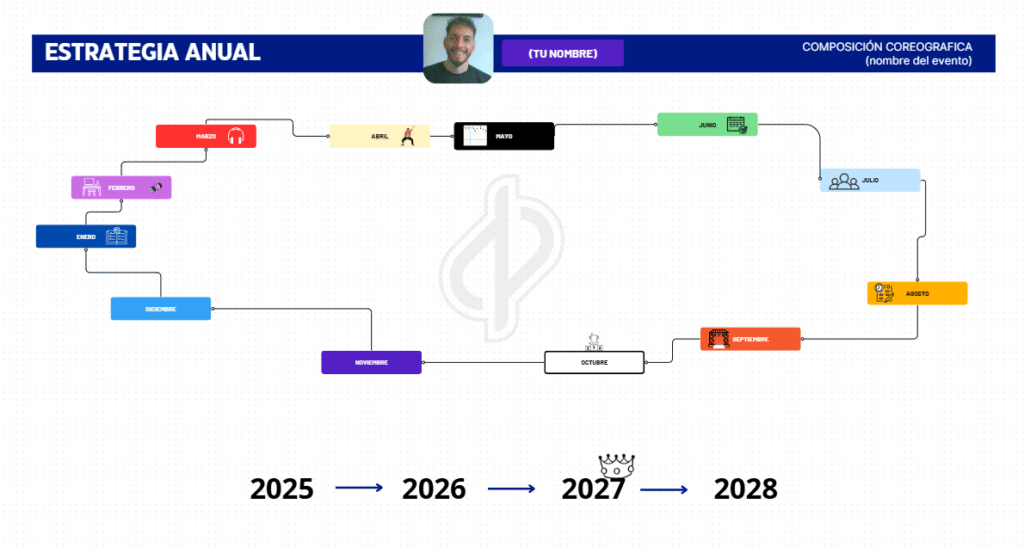 A partir de acá, vas a empezar a ver cómo convierto el caos creativo en estrategia. Esta forma de estructurar la creación coreográfica forma parte de lo que llamo el Método Estratégico Coreográfico incluido en el Curso de Composición Coreográfica para Competencias.