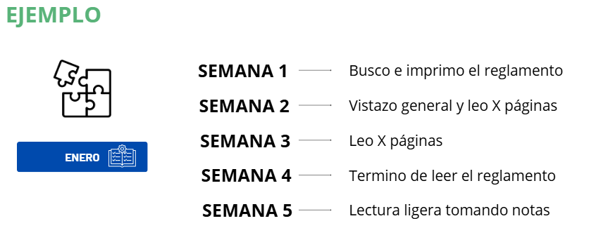 La actividad principal del mes es leer el reglamento, pero en lugar de querer hacerlo todo de una vez (y nunca empezarlo), lo distribuyo a lo largo de las semanas.